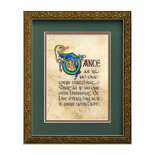 Inspired by ancient Irish monks, Celtic artist Kevin Dillon revives the art of hand-lettering using traditional techniques. He grinds semi-precious stones into paint, applies them to fine vellum, and finishes each piece with 24-carat gold leaf. Each manuscript print is a faithful reproduction of his original work.