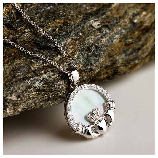 Sterling Silver Mother of Pearl Irish Claddagh Medallion Pendant with White Crystals