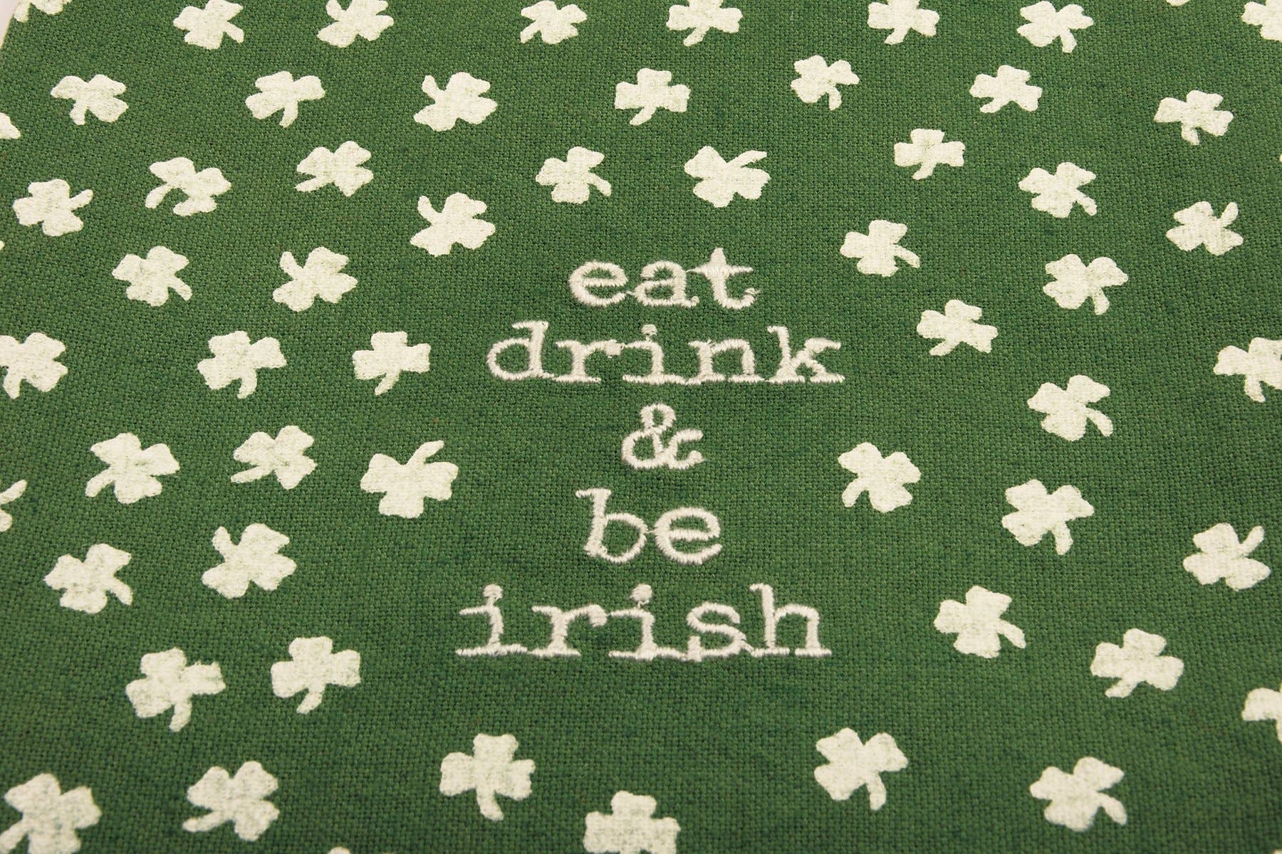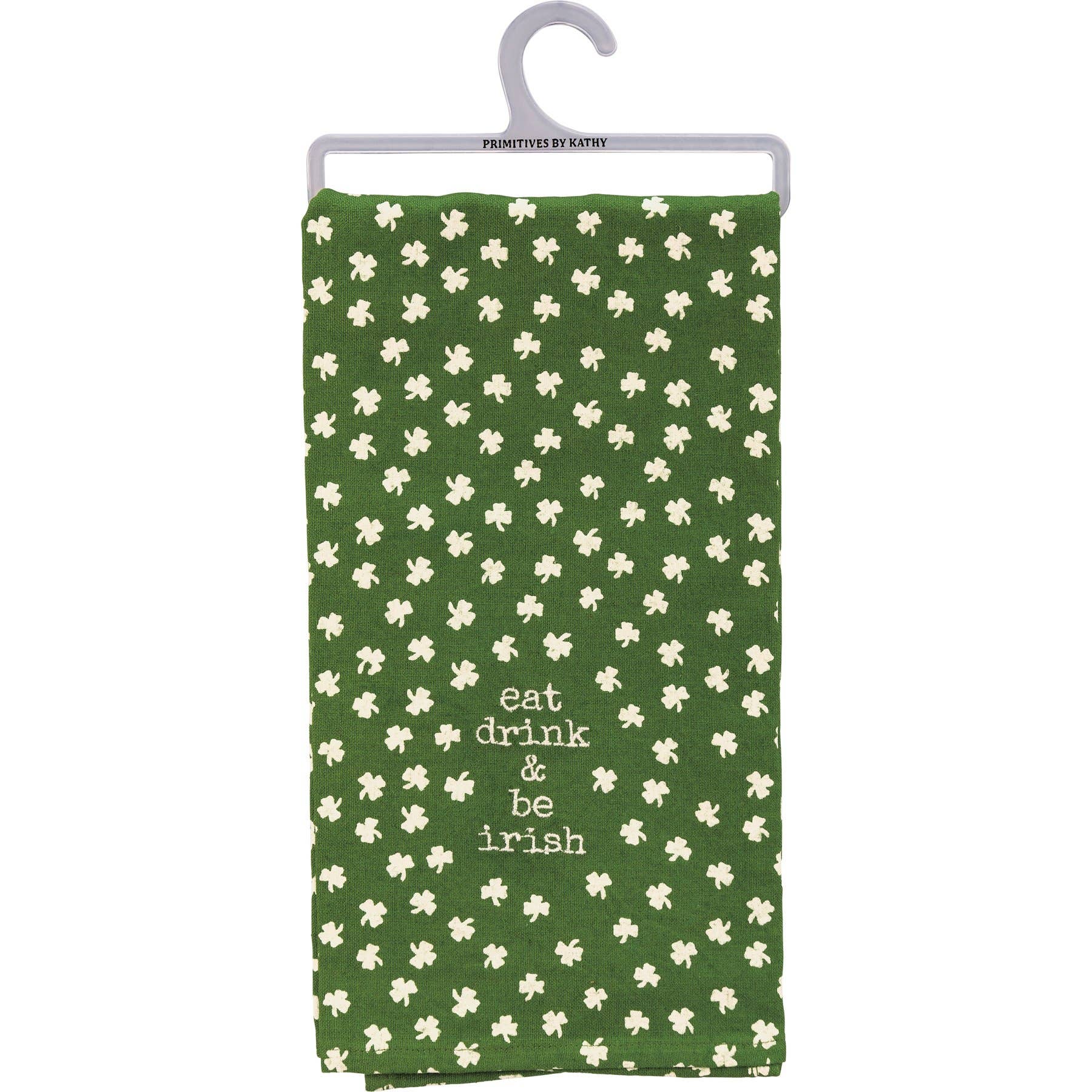 A cotton kitchen blend dish towel featuring an all-over shamrock pattern with an embroidered "Eat Drink & Be Irish" sentiment. Machine-washable.