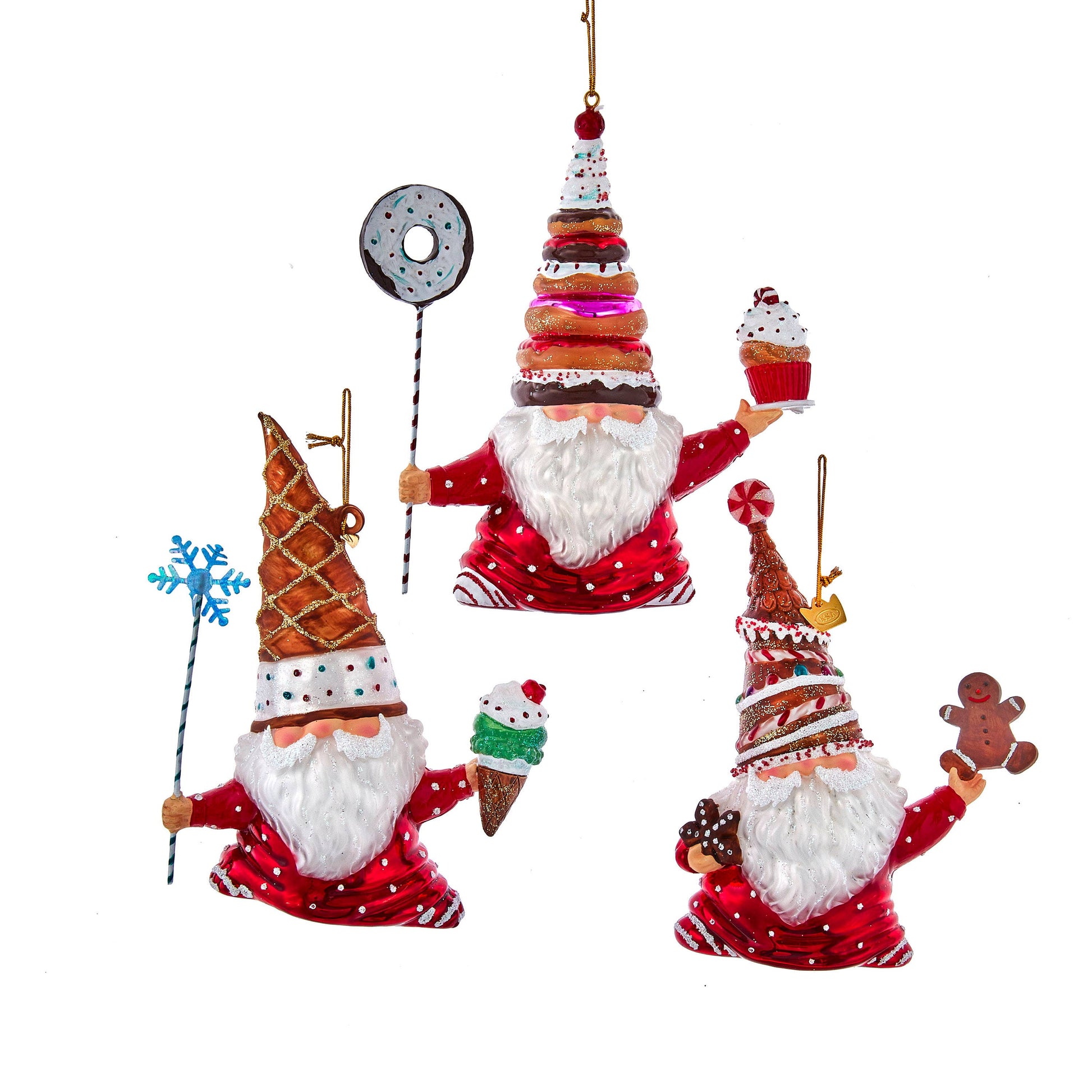 Noble Gems is a collection of high-quality glass ornaments made to last year after year. Each one is a treasured work of art. Each of these gnome ornaments features a different sweet and corresponding ice cream cone hat. One has a donut and cupcake, one has a snowflake and ice cream, and one has a gingerbread and chocolate cookie.